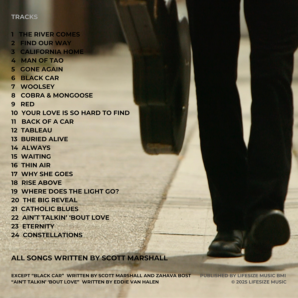 Written largely on Marshall’s 1966 Gibson 330, the only guitar he salvaged from the devastating Woolsey fire, LifeSize is as much about rebuilding as it is about remembering. “Every time I looked at it, touched it and played it, it was visceral,” he shares. “As if the guitar embodied the whole of my experiences and I had to somehow make it speak to get its stories out.” Blending alternative, roots-rock, pop, and cinematic storytelling, LifeSize nods to legends like Mark Lanegan, Nick Cave, The National, and Daniel Lanois, while carving out a singular sound that’s unmistakably Marshall’s. His voice – intimate yet widescreen – narrates tales of survival (“Buried Alive”), lust and longing (“Black Car”), spiritual reflection (“Man of Tao”), and fatherhood (“Where Does the Light Go?”) with poetic depth and raw vulnerability.